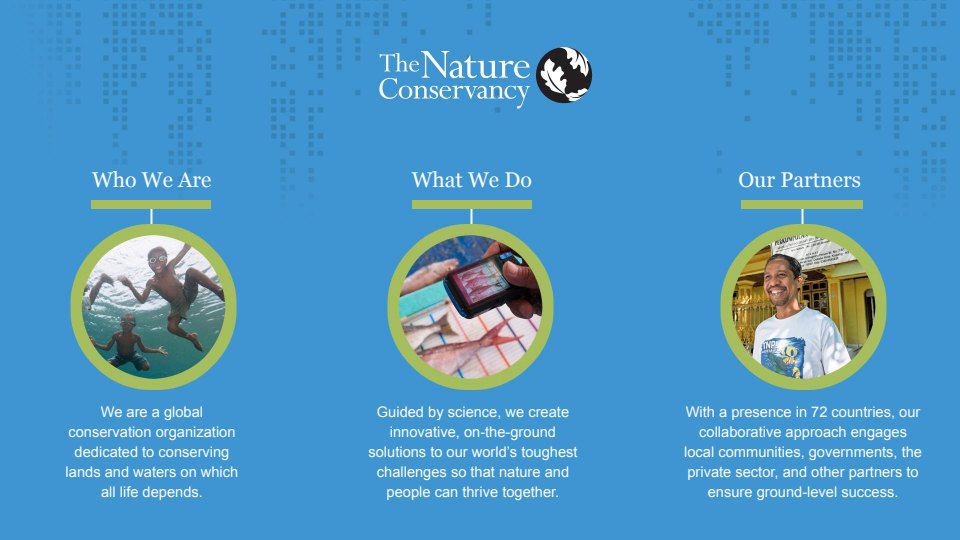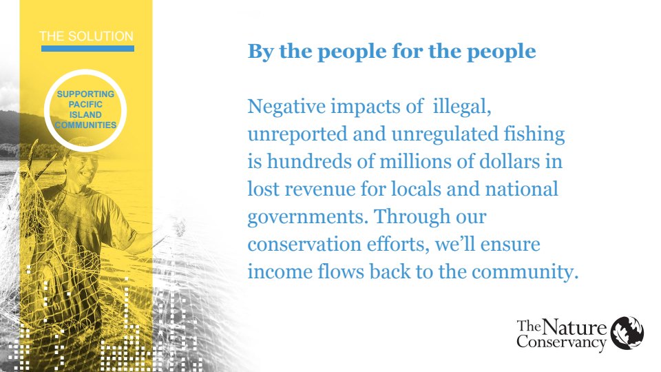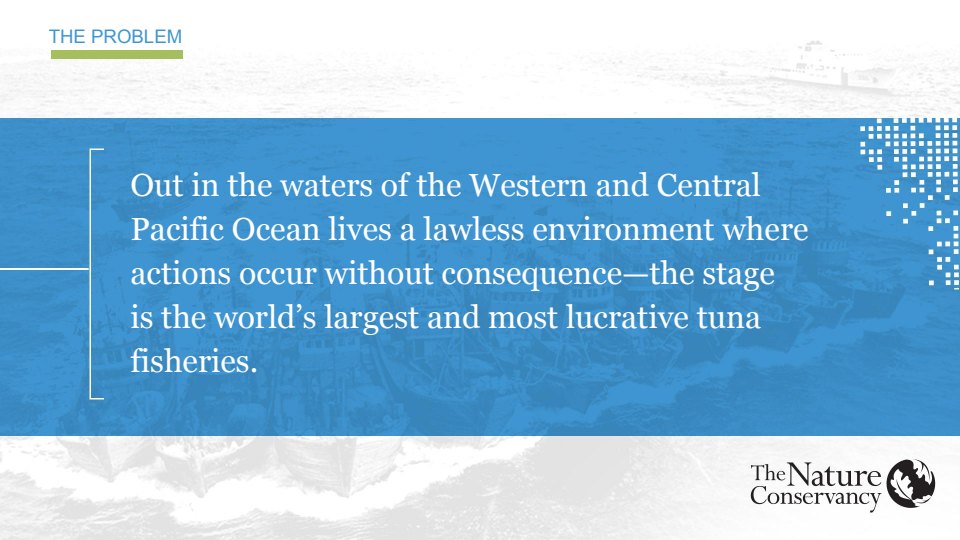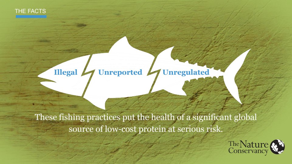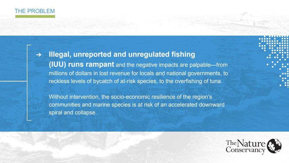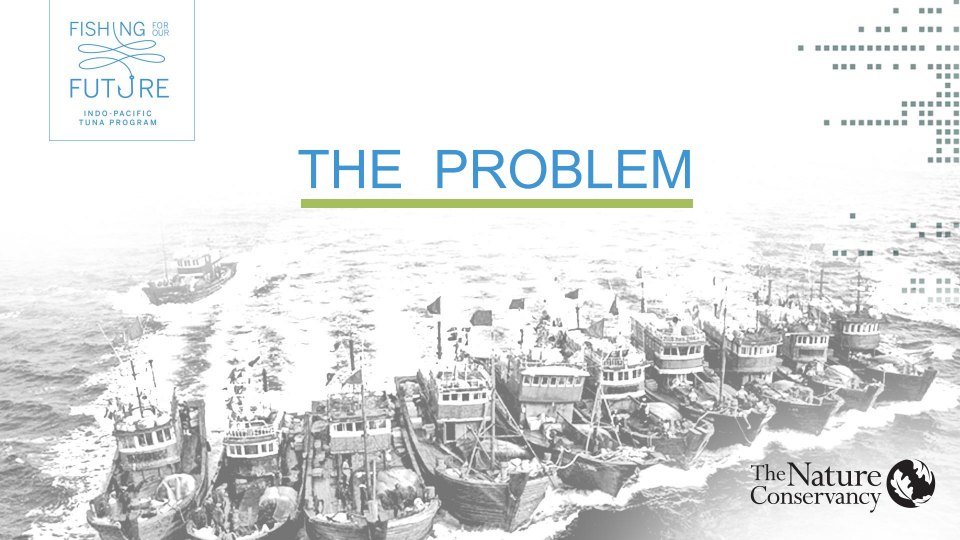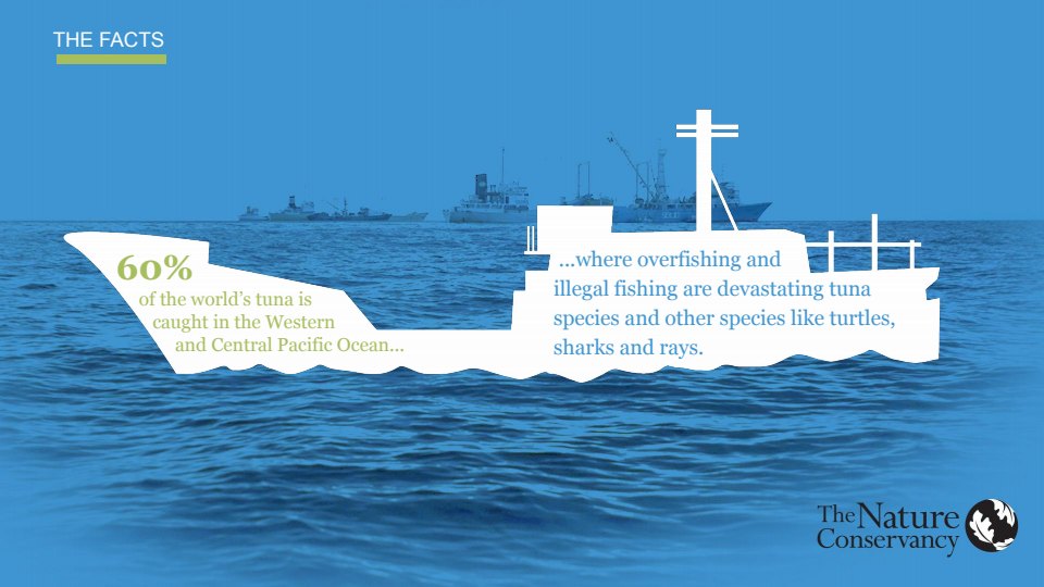A presentation detailing the problem of illegal, unregulated and unreported tuna fishing in the Central and Western Pacific ocean with the objective of inspiring people to donate to The Nature Conservancy’s Indo-Pacific Tuna Program.